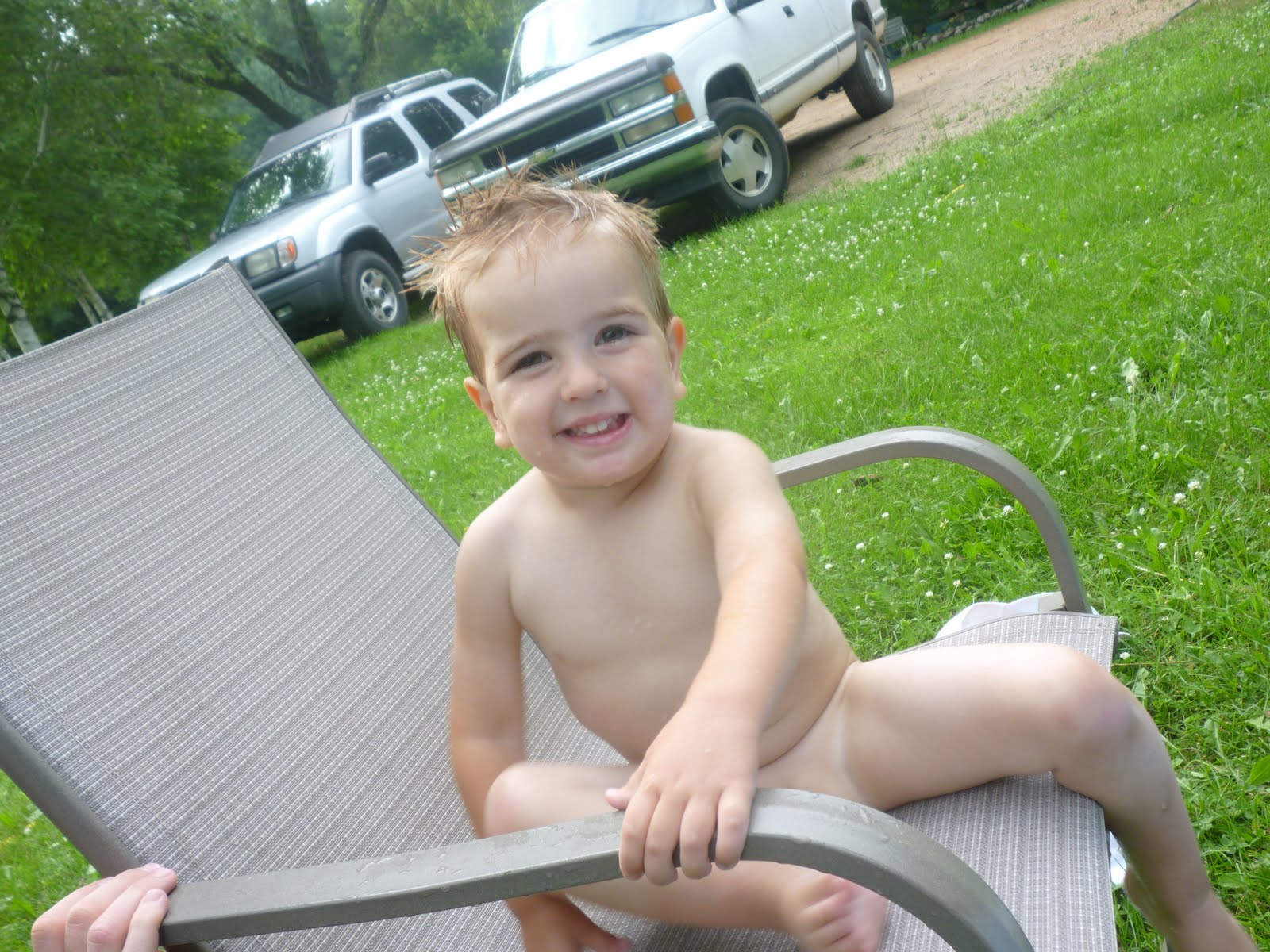 We had just come inside from an afterdinner swim (the only time it cooled off enought to go swimming) and were getting ready for bed. Jack Jack felt like laughing after his crawl across the pool to stand next to the slide.